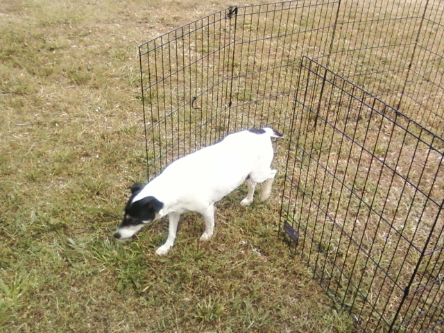 Well, no. She had her usual response to anything new: get nervous and depressed. Spike, on the other hand, accepted the pen with aplomb. This surprised me because Spike is the one who spent a long time in a small cage at the animal shelter before I adopted him. I thought the wires might bring back bad memories. But he actually looked as if he liked it. I got the feeling he felt secure in there, like he was special (which we all know he is). Bridget, on the other hand, was adopted as a puppy so she has no memory of cages, so what the heck is HER problem?
