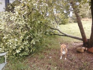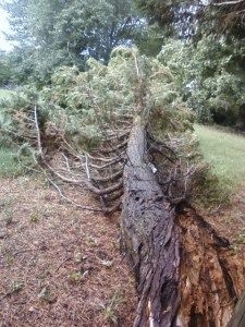 I get up to shut the window and we continue watching the movie. Soon I hear “Crack! Crack!” Crack!” I jump up to the window and look out at the back yard. My huge Leland cypress is split right down the middle and half of it is lying across the back door and in front of the bedroom window!
