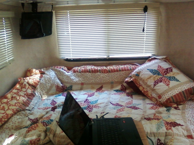 Here's the bed in full-size mode which leaves room for a small table where the laptop sits and a bench seat for me. It's so cozy, yet airy, inside. I love it! (Did I say that already?)
