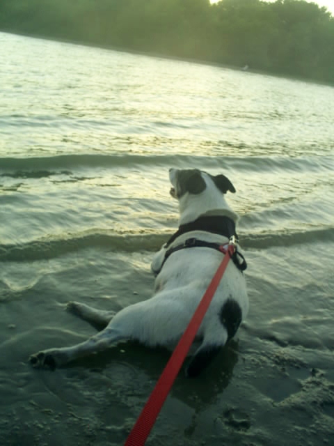 We walk down a small slope onto the sand and Spike doesn’t even slow down. Straight into the water he goes and plops down for a good soak! Bridget and I wade nearby.
