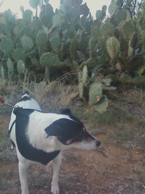 The vegetation consists of mesquite or some big honking cacti with treacherous-looking thorns an inch long. Spike attempts to lift his leg on one, but I yank him away in the nick of time. Ooh, nick . . . wrong word.