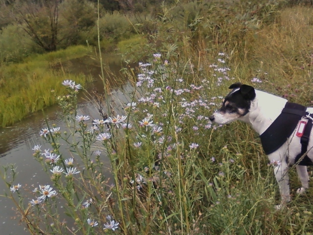 Spike is energized, quickly moving from one new scent to another. Bridget is fascinated by the moving water.