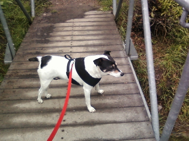 Spike, of course, has to go down the bank and stand in the flowing water.