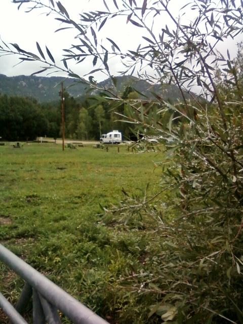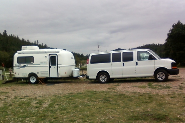 I heave the crew into the PTV, pick out a campsite on the end, and back in. I check the bubble levels . . . perfectly level! I move the crew to the Casita, chock the wheels, and complete the hook-ups.