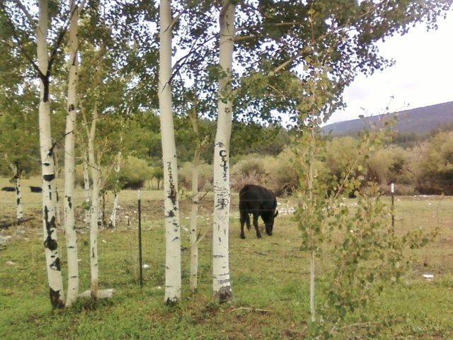 Against a mountain backdrop, in the foreground to the left, black cows graze behind a stand of aspens. To the right a soft meadow awaits.
