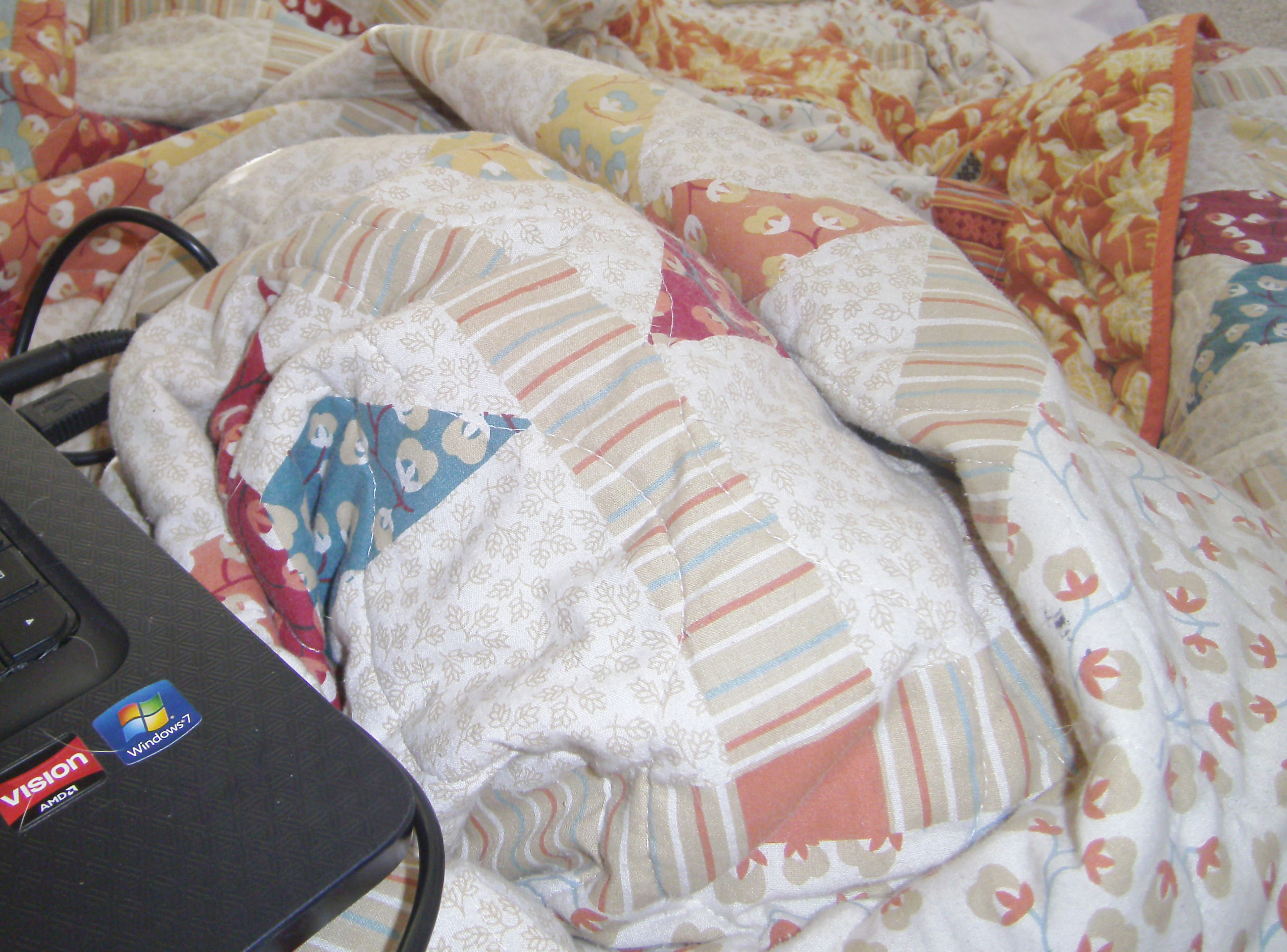 By the time I’m on the bed with the quilt over my legs, enjoying my coffee and chocolate-covered “nutrition” bar, the crew is deep into morning naptime.
