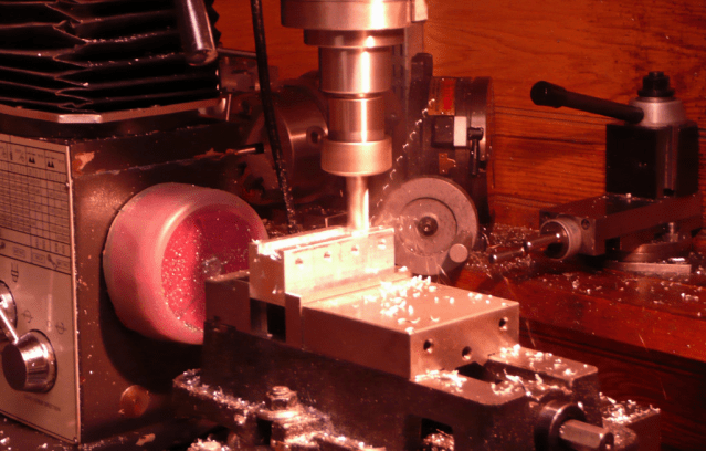 Mick is fabricating the tilt mechanism for the solar panel. Here four shock mount clevis's are being cut. Notice the line of metal curlicues flying away in a straight line.