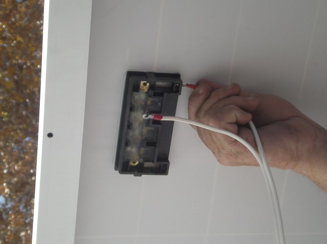 I hold the ladder. Then Bill gets up on the roof. I hold the ladder. He pulls out the wires from the box on the back of the panel and replaces them with a long, flat, white wire.