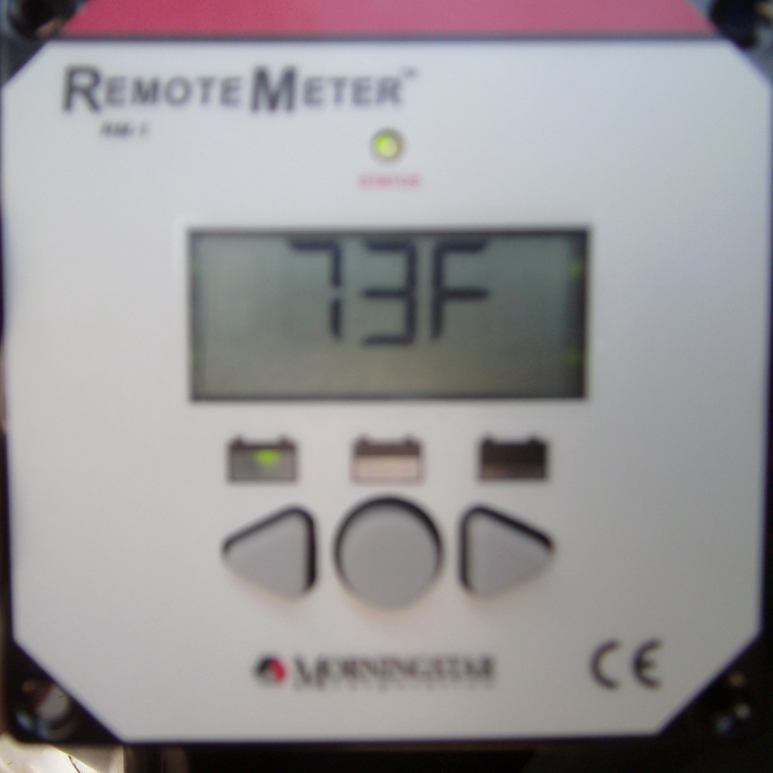 The three of us ooh and ahh over the digital window. “Wow! It’s up to ten amp hours!” “And the panel isn’t even pointed at the sun!” “The PTV’s temperature is 73 degrees!” “The batteries’ temperature is 66 degrees!” “Let me get a picture of that!”