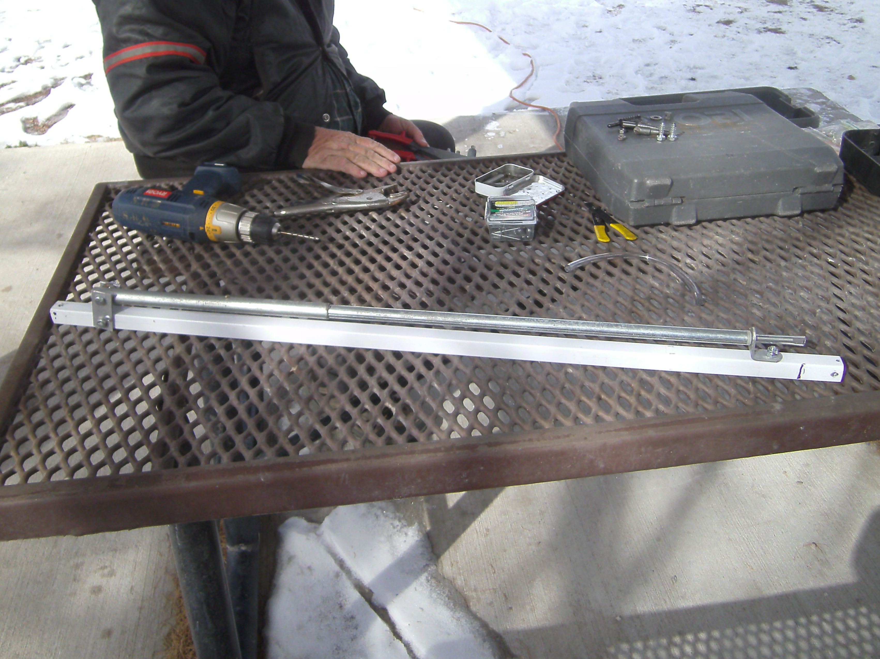 Bill puts together a found tent support and a found awning support (How’s that for recycling!), and with some sawing and drilling and bolting and metal thingamabobs, he creates a telescoping safety “arm.” It serves as my third arm to hold up the panel while I insert pins in the adjuster bars. This is so hard to explain! Look at the photos. Click on any photo and it will open on another page. Click on the photo again to zoom in.