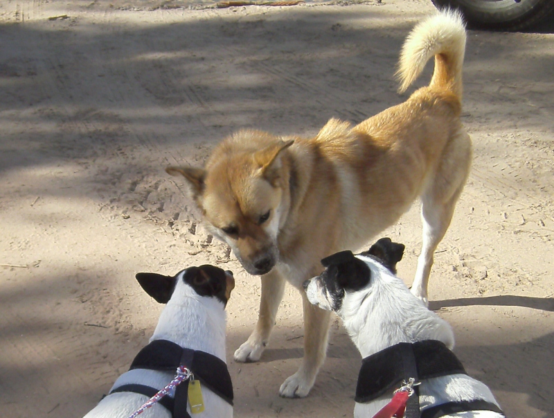 Bridget and Spike meet a dog with only three legs, and politely pretend not to notice.