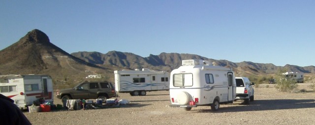 The Dome Rock area is dotted with motorhomes, fifth wheels, vans, and fiberglass trailers.
