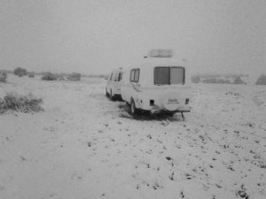 1:25 p.m. Arizona time: Heavy snow and sleet blowing sideways! The crew and I were outside right before this second blast of snow. Wondering whether Rusty’s got enough wood, we brought some pieces from the PTV over to his camp. He slid open the wood panel in his door to say thanks. He’s got plenty of wood but said he appreciated having more. We came back home, slogging through the mud and snow.