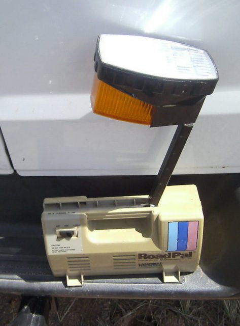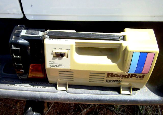 I reach into the huge cavern of the PTV and pull out an old Road Pal emergency air compressor. I show him the 12 volt end and the cord that zaps the air into the tire. “Look it even has an emergency orange light that flashes, and a regular flashlight.