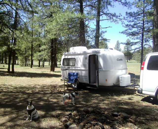 The crew and I are in our new campsite in a Ponderosa pine forest! It’s 15 miles south of Flagstaff, on BLM land called Williard Springs. There’s a pond and a meadow of green grass dotted with white flowers. The BLT rests in the shade on a bed of pine needles. The PTV basks in the sun soaking up rays. I’m not kidding when I say it’s so lovely it makes me cry! Spike and Bridget think it’s wonderful. They are so excited by the new smells!