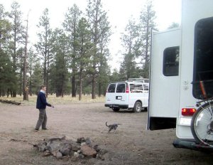 On the way out of the Coconino National Forest dispersed camping area northeast of Flagstaff, I stop at Beck and Diane’s campsite. They invited me to visit them for a brief hello before they hit the road again with their two cats, Ricochet Rocket and Feathers.