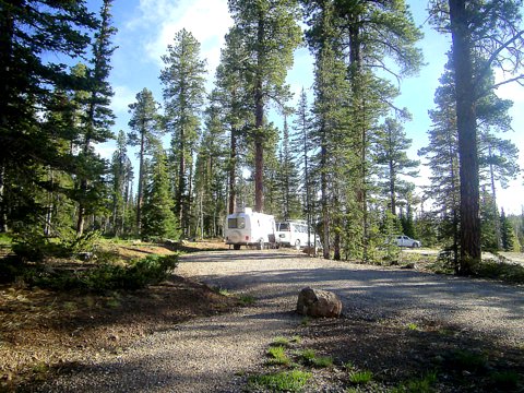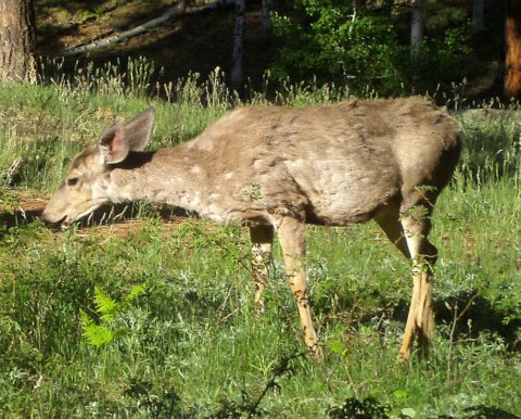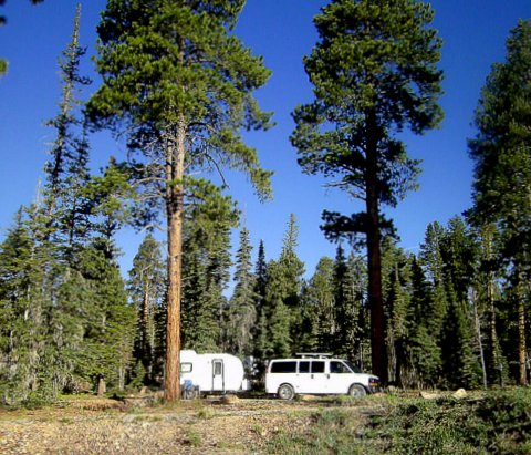 The tourist campground is packed with tents and RVs of all sorts. Two tame deer graze between campsites.