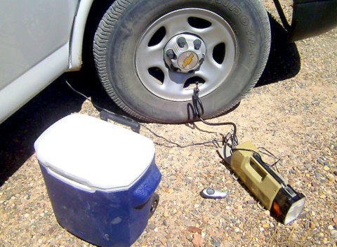 Oh no, a slow leak! The PTV’s right front tire is low. I grab the tire gauge . . 15 psi. Not good.