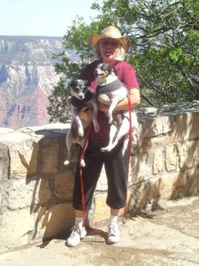 People are sitting on the porches of their little, rented cabins or on benches around the viewing area. Some are listening to a Park Service employee explain the Canyon’s geology. We continue strolling along the winding sidewalks. Spike stops us several times to make the acquaintance of various canine tourists.