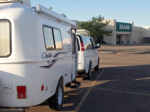 I’m in a strange city on a hot afternoon. It’s Sunday. I don’t know where any public land is located, and I don’t have internet to find any. I can’t go wandering up these huge mountains. It’s too hot to leave the crew in the PTV while I use the library’s internet. Judging from the touristy billboards, any RV park around here charges top dollar. What am I going to do?