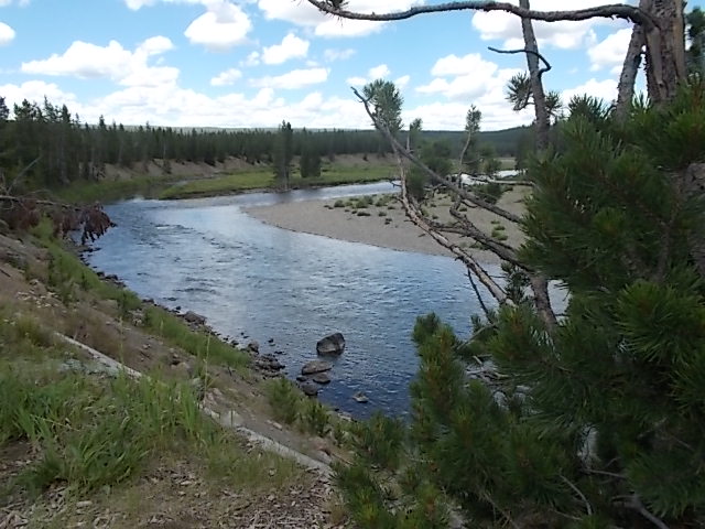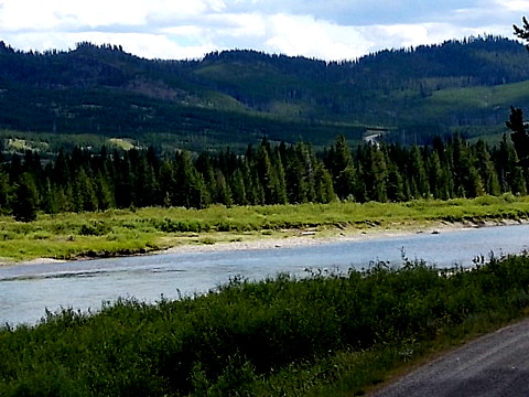 I decide to put off our excursion into Yellowstone for a day. Today I read my book, putter around, and simply enjoy our camp. The quiet here is wonderful. The young women have left for the day. The only sounds are birds, an occasional chatty squirrel, and the happy river. Spike and I wade while Bridget watches. Ah, this is the life. I can see us staying here for the fourteen-day limit. It’s a convenient, central location for exploring Yellowstone and the Tetons, and a lovely, restful place to come home to.