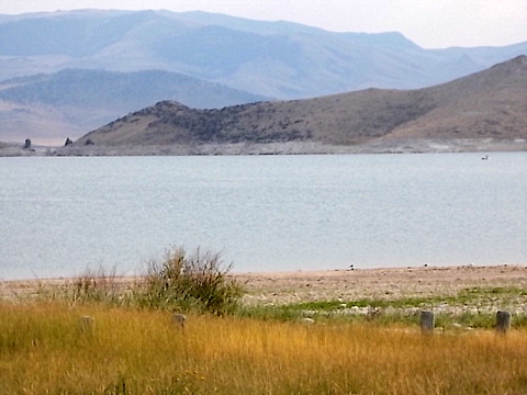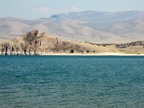 I inquire about where to buy propane and he directs me to the Centex gas station up the street. That task completed, we take the interstate southward to Clark Canyon Reservoir. The exit is right at the dam. The lake is quite large with a rocky, barren island in it that reminds me of Elephant Butte Lake in New Mexico.