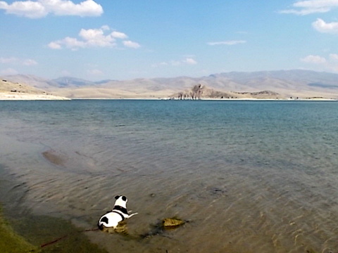 The first free campground has a stunning view of the lake. I slide the BLT into a spot on a promontory. The crew and I follow a rocky path down to the water. Spike takes a little soak and Bridget romps around on the sand.