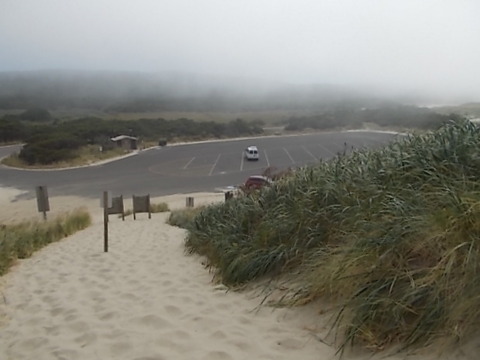The first stop reveals a parking lot at a big dune with sand board marks on it. The second stop reveals a parking lot in front of dunes with wide tracks all over them. It’s a staging area for OHVs — Off Highway Vehicles are scattered about. Our third stop is a parking lot at a dune that promises access to the beach. Yippee!