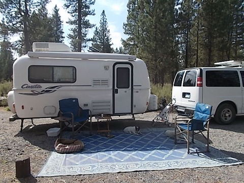 I say, why not? The only other camper in Williamson River National Forest Campground is, of course, in the sunniest site. That’s because they don’t have a solar panel. It’s also the nicest site. So I covet, covet, covet. I’m so covetous that I don’t unhitch lest I miss an opportunity to get that site.
