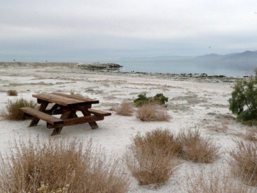 Our first glimpse and smell of the Salton Sea is at Mecca Beach State Park.