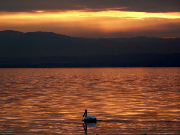 As the sun sets behind the mountains on the far shore of the sea, gold glimmers across the dark, silken water.