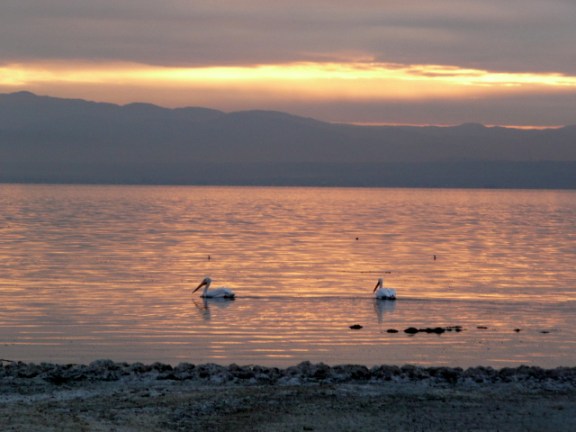 Sorry you came to the Salton Sea when it wasn’t a good time to be here. Right now I’m looking out the big side window at the prettiest shade of blue water, white pelicans floating along, birds flying across the scene, purple-grey mountains, gorgeous!