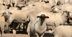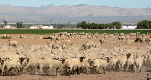 We pass the school. Oh, these poor people, trying to make a living and raise a family here. The town disappears behind us and we enter an agricultural area, green fields on both sides of the road. No dump station. We must’ve passed it. I look for a place to turn around. Huh? What’s this? Sheep!