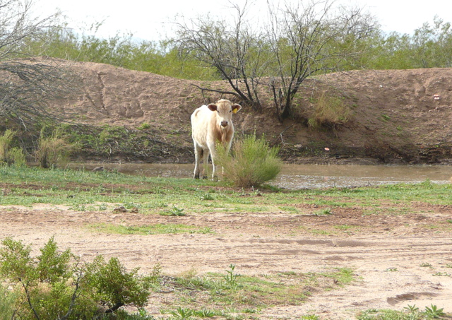 I don’t know if Spike sees or smells the water behind that bovine, or if he determines that he doesn’t want to approach the pond guard. Bridget, Spike and I head for home.