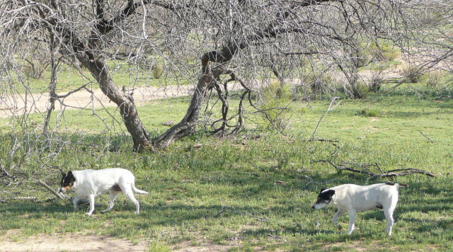 A roadrunner runs (of course, what else?) out from under the scraggly arms of the mesquite tree. It zigzags across our lawn. Spike is asleep under the PTV and oblivious. Bridget watches this scrawny visitor for a brief moment before dropping her head back down in the grass.