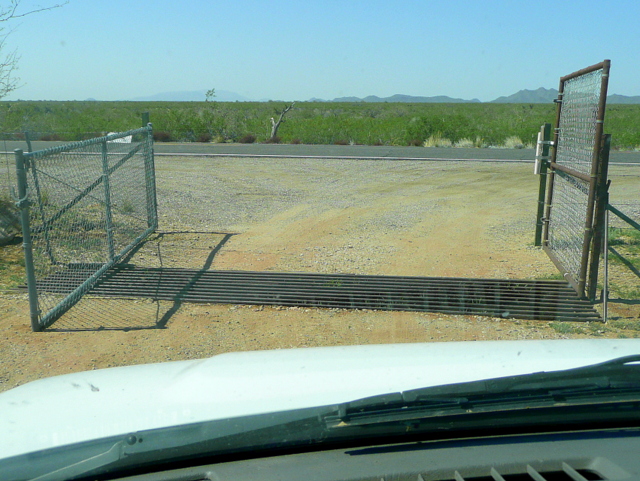 The crew and I head into town. (The photo shows the gate over the cattle guard we traverse to get on Hell’s Highway.)