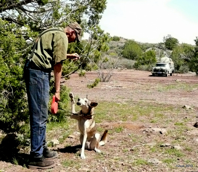 Hi Sue! I think I gained 5#s yesterday just reading the food comments on your blog!!!! I LOVE how your Spike is so protective–what a guy!!! We’re still here west of Tucson–Love the weather. We had 3 feet of snow when we left N.MN. last week!!! This sure is FABULOUS!! I can now see why you love this life! It still has’nt sunk in that we are retired–NO Schedule!! We enjoyed talking with an elderly man yesterday that was “boondocking”. I want my hubby to understand more about it! So glad to see you, the crew and Rusty&Timber met up again. Hugs to the pups. Dixie