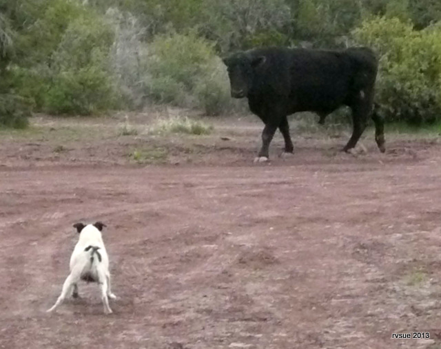 He makes deep, rumbling noises along with loud screams. He paws the earth like bulls do when they’re about to gore a matador. His cojones are bigger than Spikey’s head! I can easily imagine all that beef-on-the-hoof running headlong into the side of the Best Little Trailer. Rusty pounds on the wall of his camper with a hammer when the bull comes near his campsite which is somewhat effective.