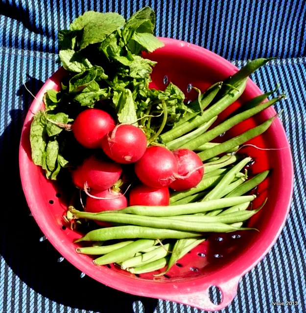 This morning I take a colander of radishes and green beans out to my camp chair. It’s a sunshiny, breezy morning here at Juniper Hill Camp in central Arizona, east of Prescott.