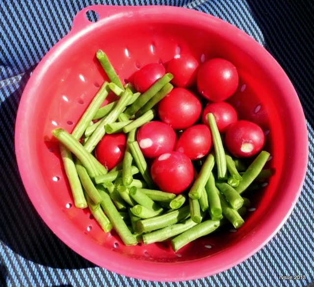 I strip the radishes of their tops and roots and store them in the fridge. I snap the beans.