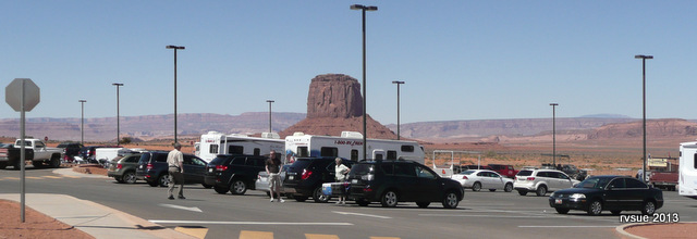 They proclaim the presence of the Visitor Center and hotel to the right and Gouldings RV to the left. I turn right and roll into the waiting arms of the toll booth. I see the NO CAMPING sign next to the face of the man who takes my $5. A line of RVs and cars are ahead of us and in the side mirror. This does not look good.