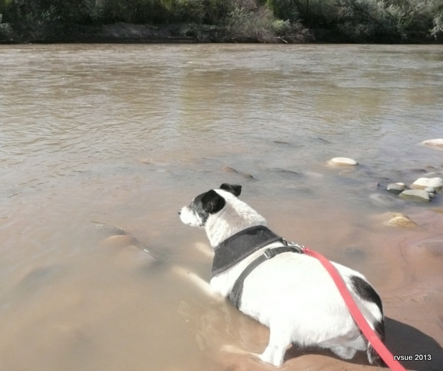 When Spike saw he had access to the river, he went for it. How he loves to soak! He doesn’t care if he gets to swim, as long as he can drop his belly into the water.