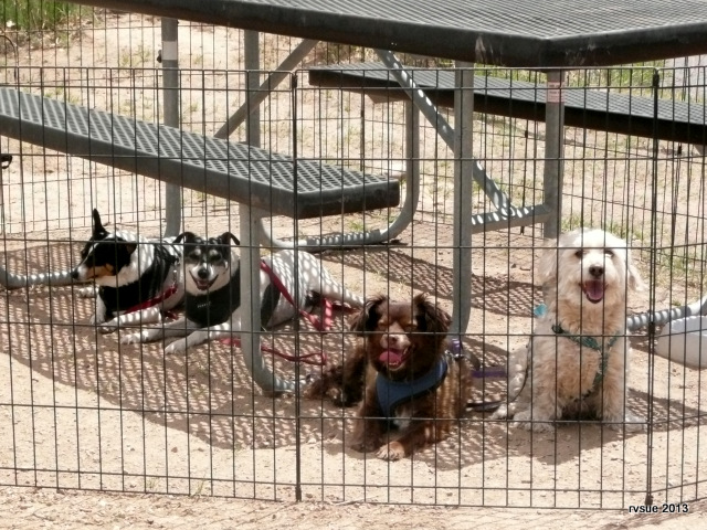 So Spike gets his first soak of 2013 – I’ll bet he’s a happy camper now! The crew and friends look comfy and happy together under the table. My mother and I camped in Mesa Verde about 5 years ago – you have a treat in store! But be prepared for a lot of driving, it’s a huge park.