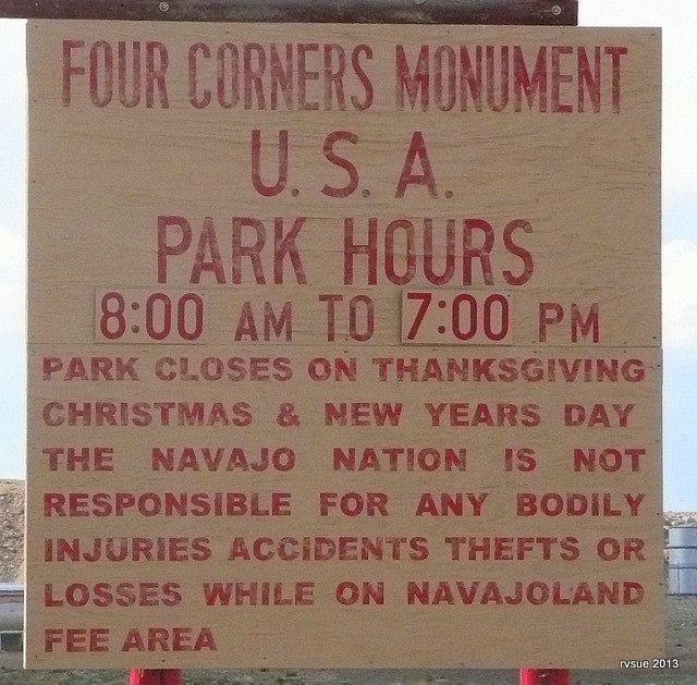 I don’t know what the fee is. It’s not that Chuck and I are so cheap. After a day that was already full, it wasn’t appealing to drive through the 4 Corners gate to see some signs telling us where the states area.