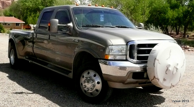 Friend Chuck and I climb into his Ford F450-V10 truck and pull out of Sand Island Campground, Bluff, Utah.