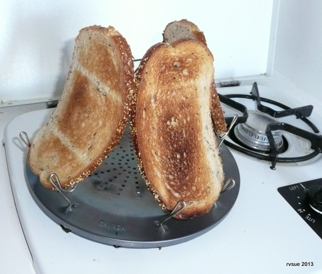 Until NOW! While at Many Trails RV yesterday, I bought a contraption for toasting over a stove. (An electric toaster draws too much power.)