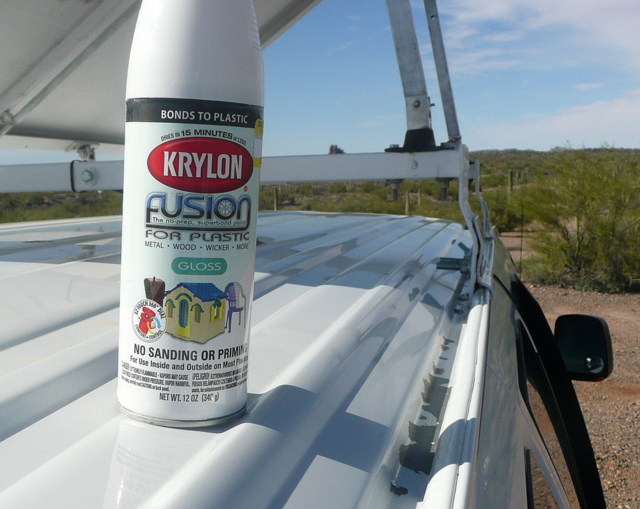 First I sand the gutter well. Then I wipe it clean. Using pieces of cardboard I saved for this purpose, I shield the PTV’s windows below and spray-paint the gutter with white gloss paint. Beautiful!