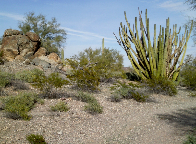 Organ pipe cactus and boulders